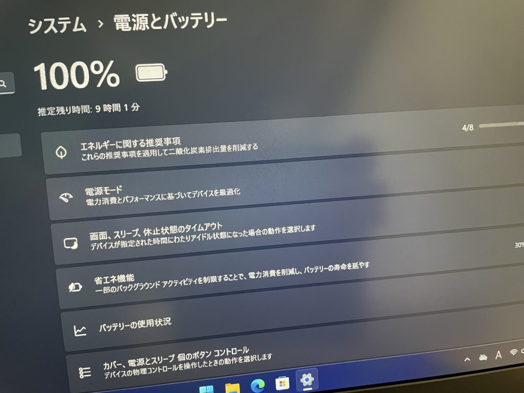 バッテリ 充電した状態で9:01(100%)と表示しました。バッテリは消耗品のため保証はできません。