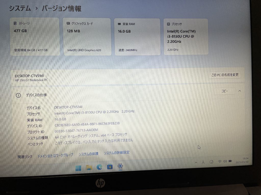 型番:HP Notebook 250 G7