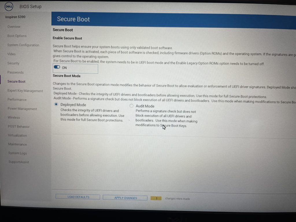 Secure Bootの設定もOFFになっていたので、ONに設定変更をしてみる。