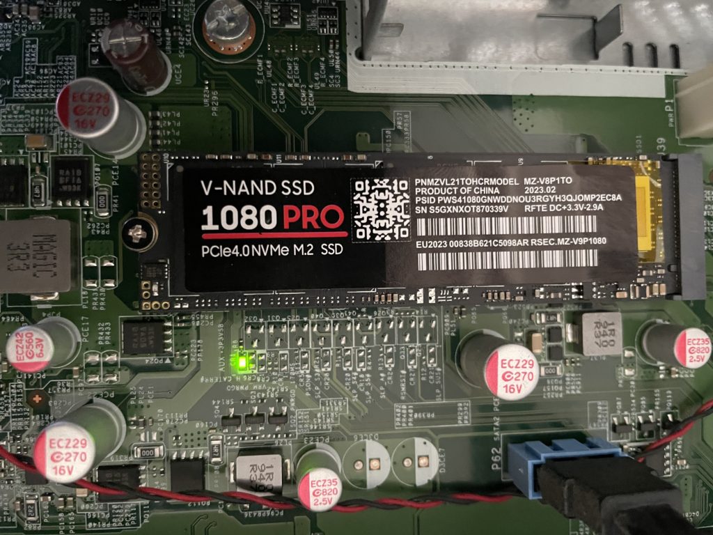 パーツを1つ1つ外して起動し、起動出来るようになった時に外していたのがSSDで、SSDを接続したまま起動すると赤ランプが点滅しているため、故障と断定できました。