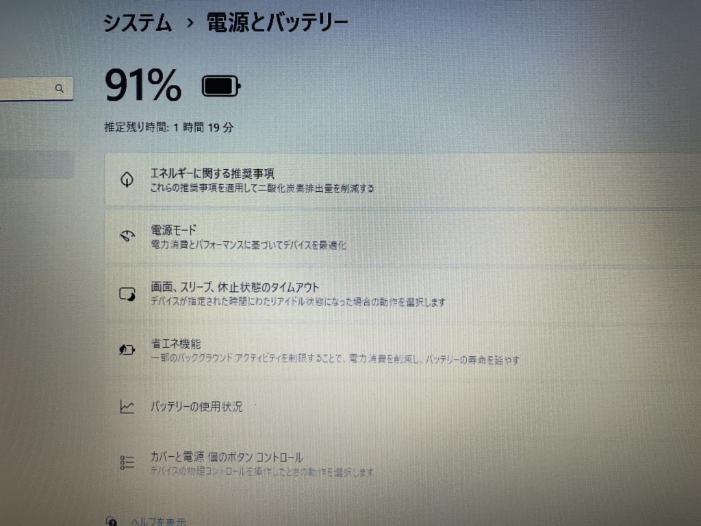 バッテリ 91%の時に1時間19分と表示しました。バッテリは消耗品のため保証はできません。