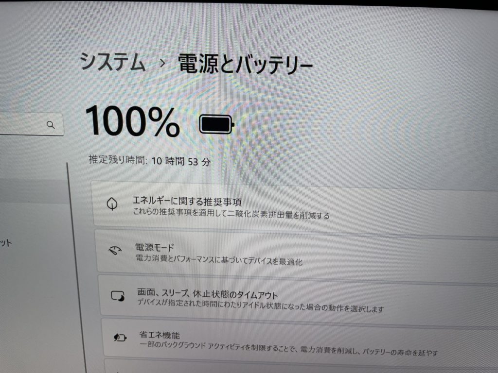 バッテリ 100%表示で10時間53分と表示しました。バッテリは消耗品のため保証はできません。