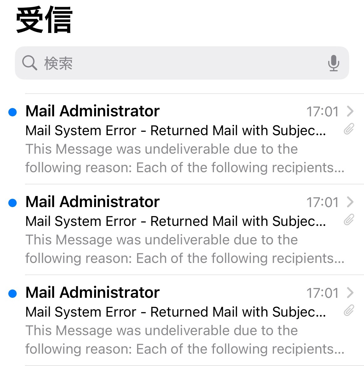 届いている件名「Mail Administrator」はメールの「不着通知」です。
