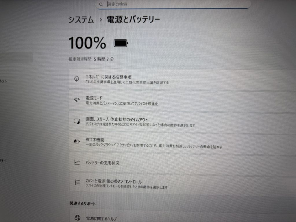 バッテリ 100%まで充電出来、残り時間は5:07と表示します。バッテリは消耗品のため保証はできません。