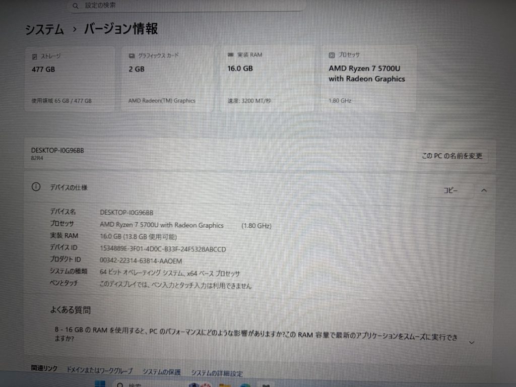 Ryzen7で高性能、メモリが16GB、SSD512GBもあって快適にお使いいただけます。