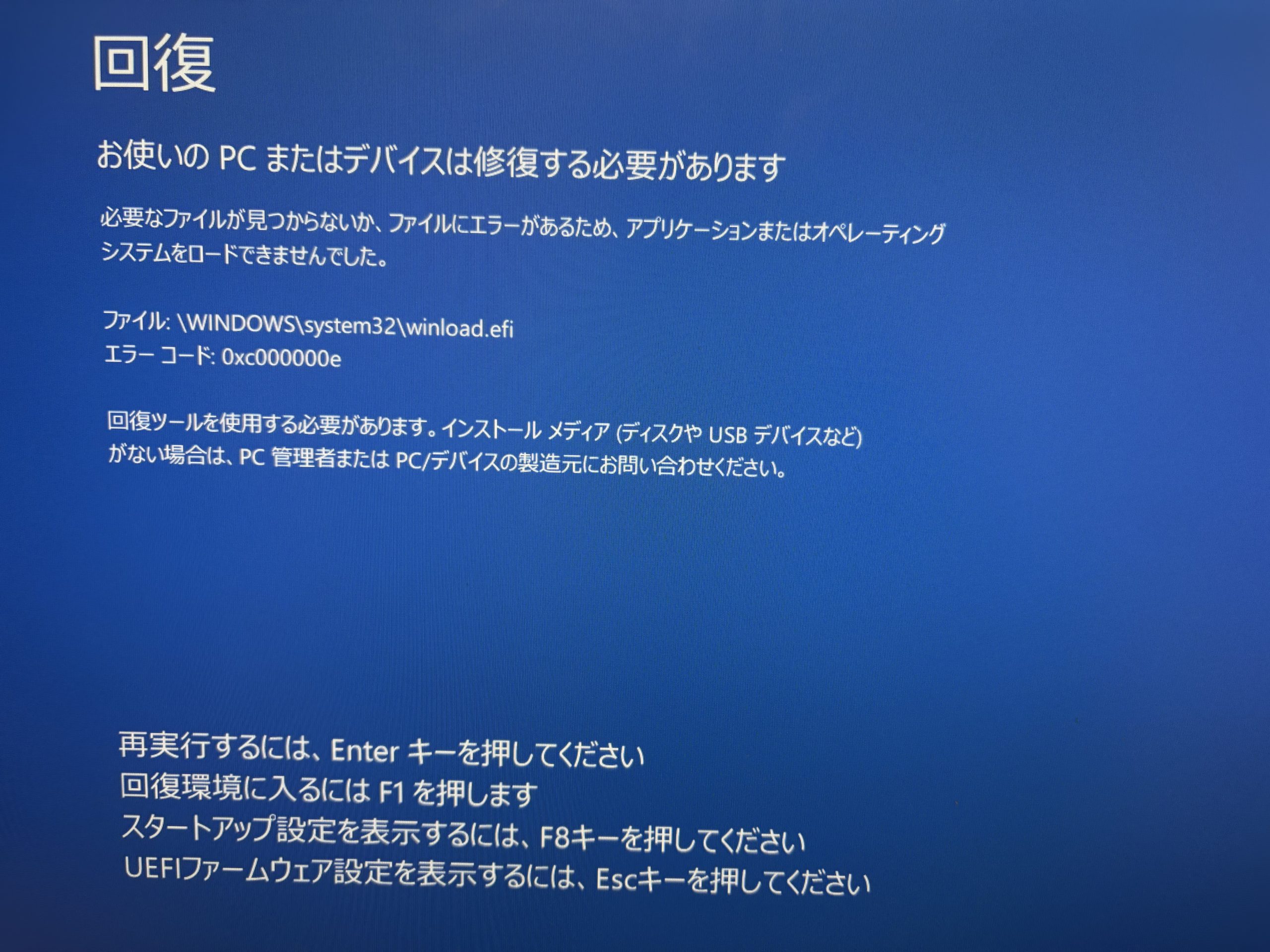 F1を押して回復環境に入り、「スタートアップ修復」や「システムの復元」を試みましたがダメでした。