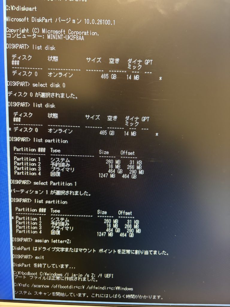 diskpartを実行して起動するlist disk→ OSディスクを確認select disk #(#は自分のディスク番号)list partition→ システム領域の番号を確認select partition #(#はシステム領域の番号)assign letter=Z:exit