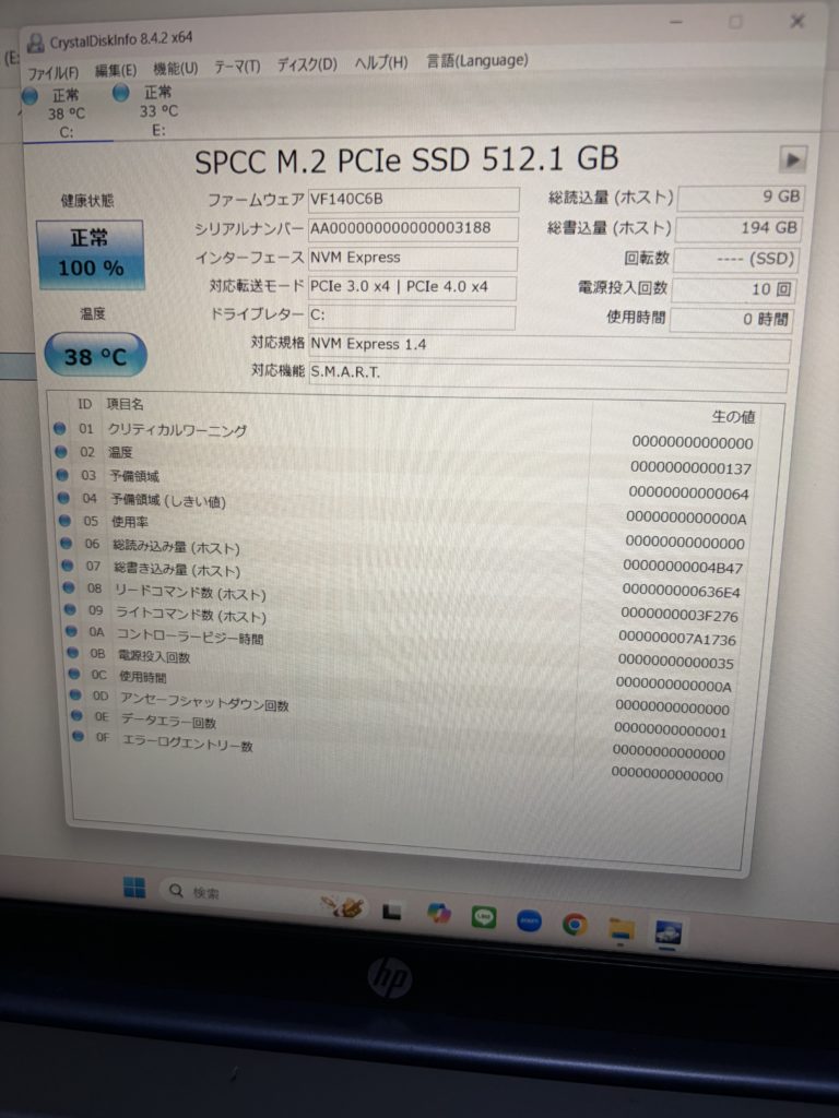 お返しする前に、CrystalDiskInfoでSSDの状態を確認すると、健康状態が低下しており、総読み書きサイズが多いため、SSDの交換をオススメしました。